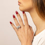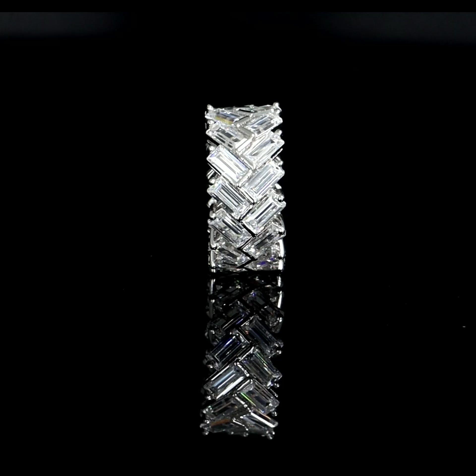 With baguette-cut faceted cubic zirconia and English setting alternated with prongs.