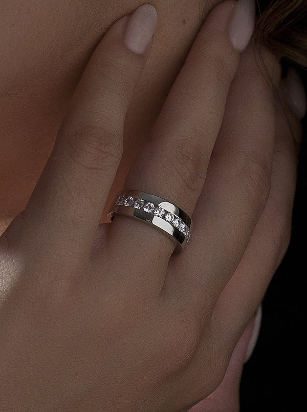 Three-lane design rings made of plain silver and zirconia. A perfect ring for your most special occasions; it will go great with your favorite dresses. Ring made up of three lanes, two of them made of plain silver and one of them made up of a lane of central zirconia. You will love it!