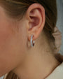 Silver hoop earrings for women. Fashion earrings that will stand out on your ear alongside other types of earrings. Earrings with a row of set white cubic zirconia. Large size. Very basic, timeless, and simple earrings that will add a trendy touch to your daytime looks, and chic to your nighttime ones.