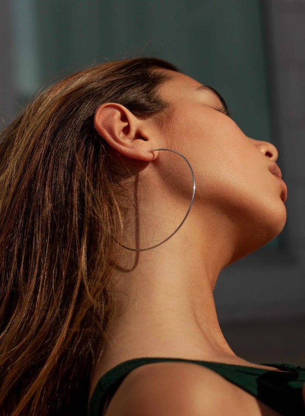 Pendientes aros grandes diseño maxi finos en plata lisa. Perfectos para lucir en tus veladas más importantes incluso de día para una comida con tus amigas. Joyas de moda que harán brillar tu oreja y podrás combinar con otros tipos de pendientes. ¡Atrévete con este maxi diseño!